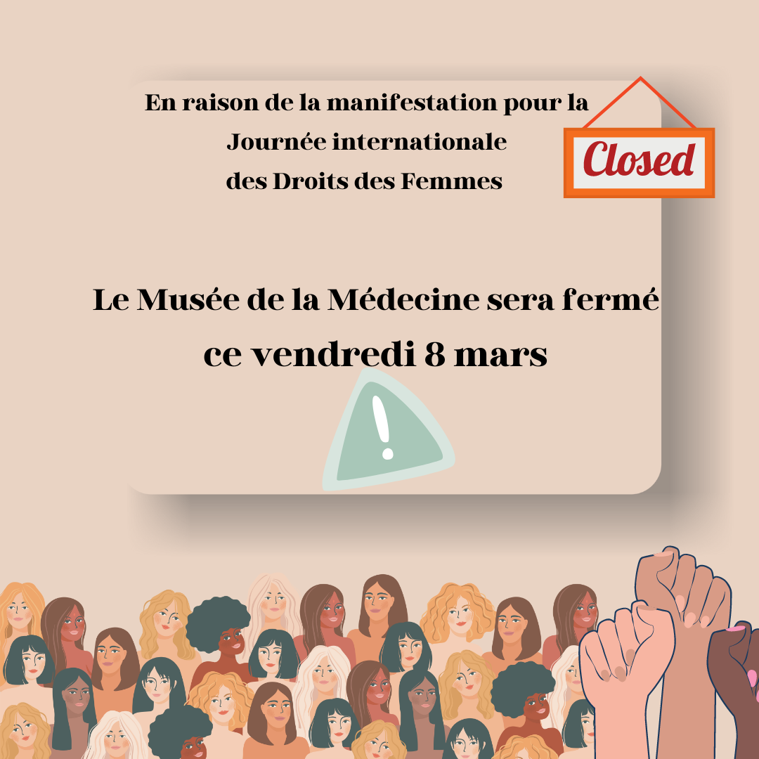 Le Musée de la Médecine sera fermé ce vendredi 8 mars 2024 en raison de la Journée internationale pour les droits des femmes et suite aux perturbations du réseau STIB Veuillez nous en excuser. Le Musée sera ouvert ces samedi 9 et dimanche 10 mars 2024, nous vous attendons.