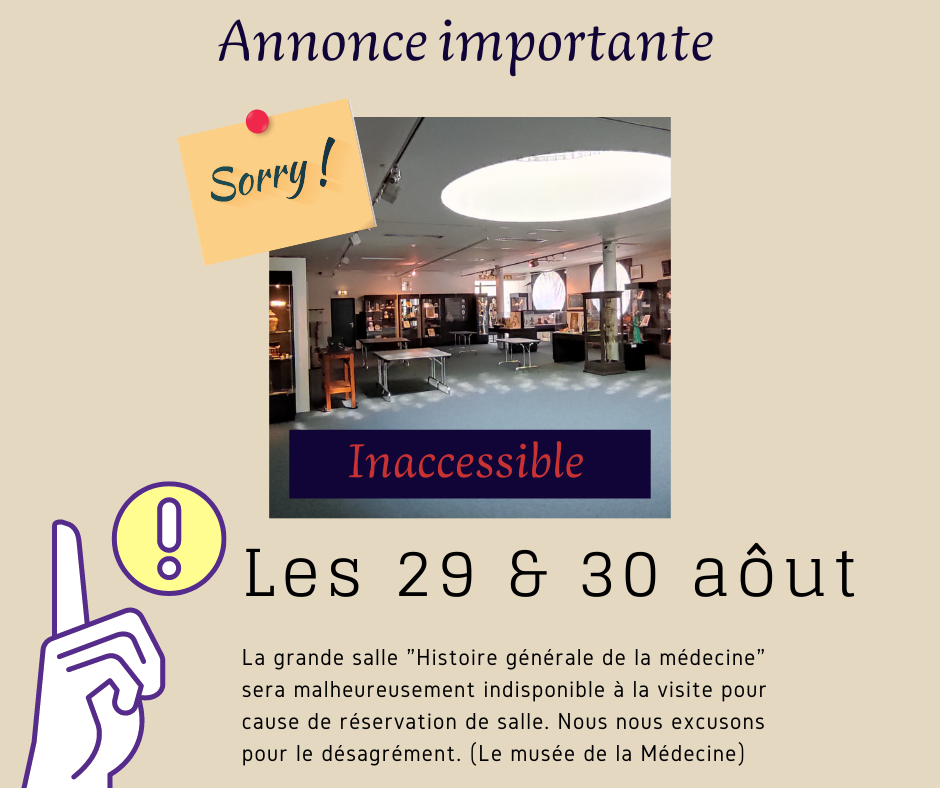 DétailsNous attirons l’attention de nos visiteurs sur le fait que le 29 et le 30 août, la salle d’Histoire de la Médecine ne sera pas accessible aux visites pour cause de réservation. Nous nous excusons pour ce désagrément, les 6 autres salles restent à votre disposition pour une agréable visite. Nous vous souhaitons une agréable…