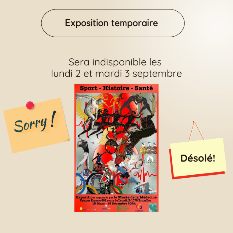 Exceptionnellement, le Musée de la Médecine sera inaccessible ce samedi 7 septembre 2024 et réouvrira le 8 septembre 2024 de 12h00 à 16h00. (attention! la dernière entrée se fait à 15h00 les salles fermant aux alentours de 15h45.) Merci d’avance et bonne semaine à tous et toutes.