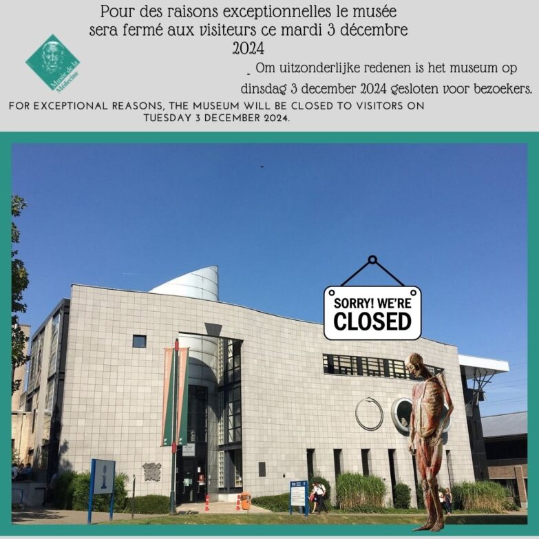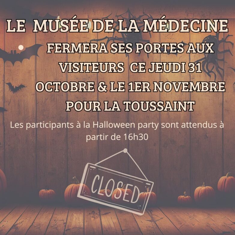 Le Musée de la Médecine sera fermé pour les visiteurs ce 31 octobre 2024 en vue de l’Halloween party ainsi que le 1er novembre à l’occasion de la Toussaint. Les participants à l’évent Halloween sont attendus dès 16h30. (selon vos réservations) Le Musée accueillera les visiteurs le week-end de 12h00 à 16h (dernière entrée…
