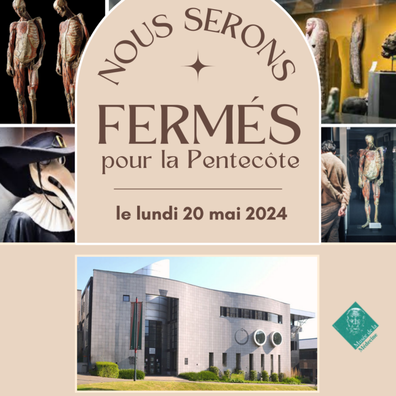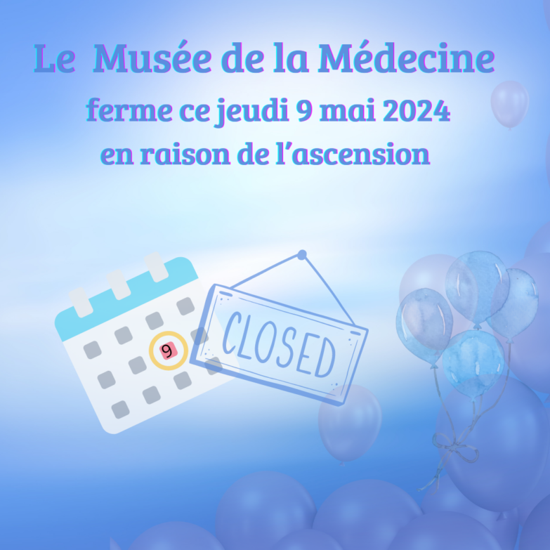 Le Musée de la Médecine sera fermé ce lundi 20 mai 2024 en raison de la Pentecôte. Mais nous vous accueillons ce week-end 18&19 mai de 12h à 16h; Venez nombreux