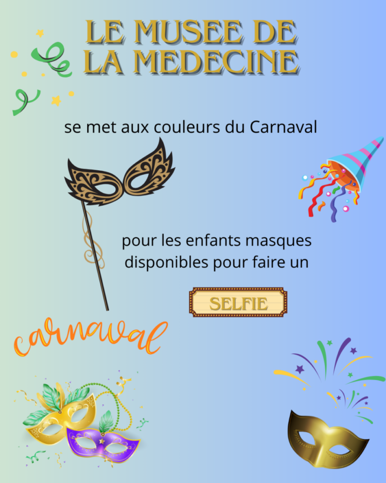 A l’occasion du Mardi Gras et des congés le Musée de la Médecine se mets aux couleurs du Carnaval. Des petits masques seront disponibles à l’entrée pour les enfants souhaitant se prendre en selfie lors de leur visite.